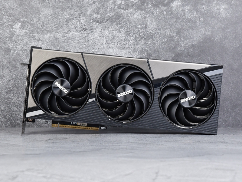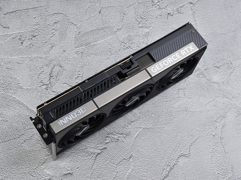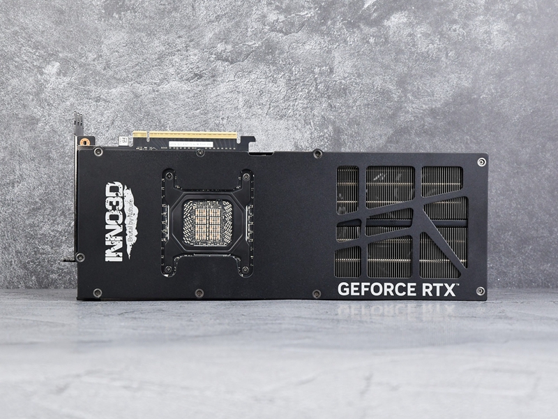 卡体顶部左侧的INN03D logo配有白色背光,16pin供电口位于中间偏右侧一点的位置,再右侧的金属拉丝面板上也印有“GEFORCE RTX”字样。