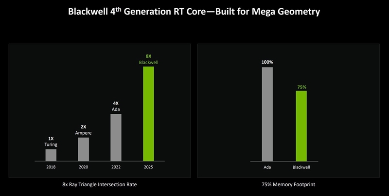 在第4代RT Core中,简单来说它相比Ada架构,在渲染光线追踪场景时,提供了两倍光线三角形相交测试吞吐量,并引入了Mega Geometry的结构算法。