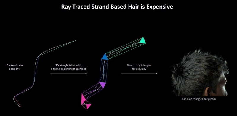 此前渲染头发仍然需要最基础的三角形来表达物体,如图所示,发丝中的一个线段需要6个三角形,而一根头发便需要无数个三角形来确保其精度。比如我们的头发则需要600万个三角形来表达。