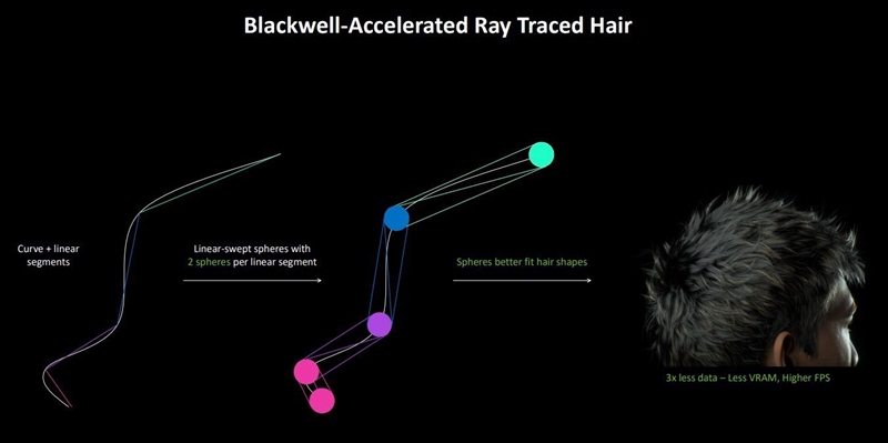 LSS(线性扫描球体)是Blackwell架构中新增的图形语言,它极大地简化了复杂头发和毛发的渲染开销,并能提升质量。