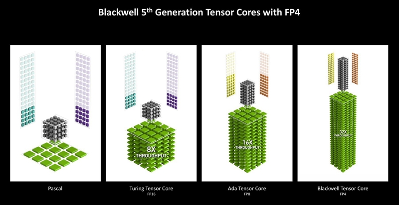 与NVIDIA Ada Tensor Cores一样,Blackwell架构的Tensor Cores支持FP16、BF16、TF32、INT8、INT4和Hopper的FP8 Transformer Engine。