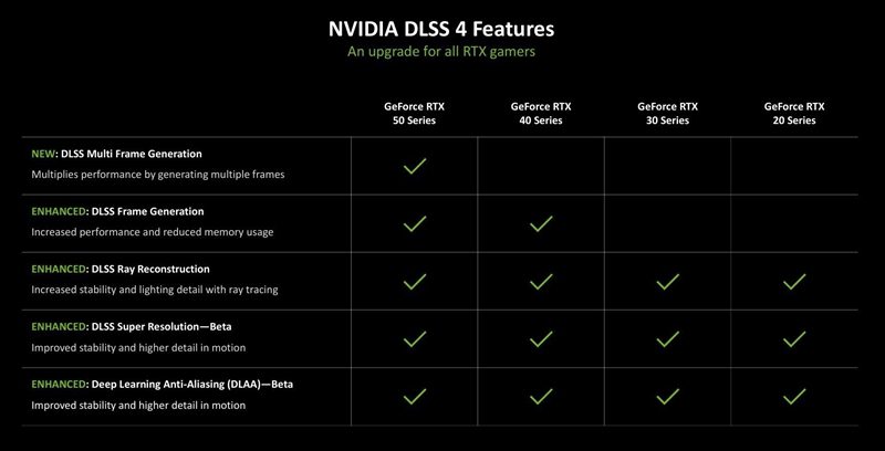 DLSS 4是本代RTX 50系显卡带来的重大更新,对于玩家来说它也是最能实际感受到的。最新版本DLSS 4带来了新的多帧生成(MFG),具有更快的性能和更低的显存使用等特性。包含超分辨率(SR),光线重建(RR)和深度学习抗锯齿(DLAA)模型,可进一步增强图像质量和稳定性。