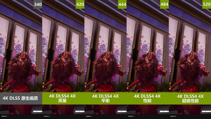 在画面对比中,DLSS 4 4X的四档画质也很难看出区别,角色的头发、衣服,远处的建筑涂绘,基本都和原生画质分毫不差。从目前两款支持DLSS 4游戏的测试中可以明显看出,DLSS 4确实有着质的飞跃,在帧数大幅提升的同时,画质相比DLSS 3也更好。