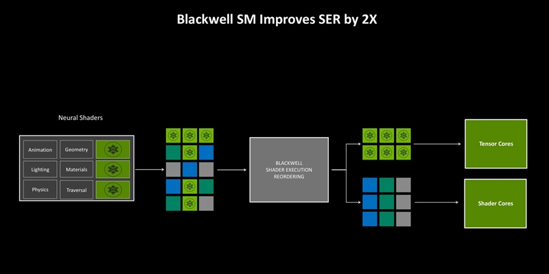 因为连贯执行神经工作负载的线程可以直接发送到Tensor Core,所以SER也显著加速了神经着色。在Blackwell架构中,SER的核心重排序逻辑效率是原来的两倍,减少了重排序开销并提高了精度。从而进一步提高了该功能的有效性。这项功能更多地是为应用程序开发者而设计,它仅需一个小的API改动,即可执行重排序操作,进而提升总体项目的负载性能。