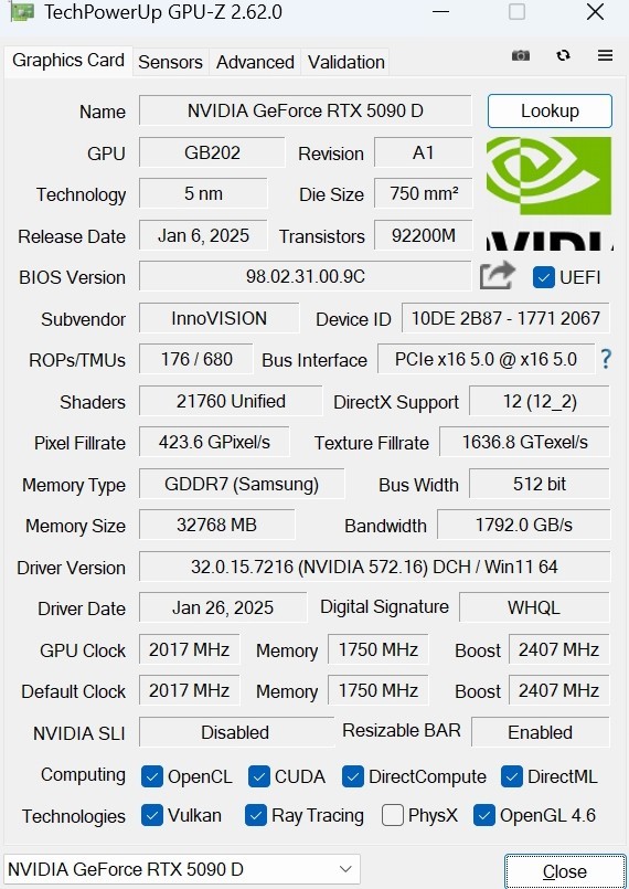 映众 RTX5090 D 曜夜 X3 32GB采用GB202核心,采用与上一代相同的TSMC 4nm定制工艺(TSMC 4nm 4N NVIDIA CustomProcess),芯片面积750mm2。值得注意的是,在RTX 50系显卡中,使用了PCIe×16 5.0带宽。