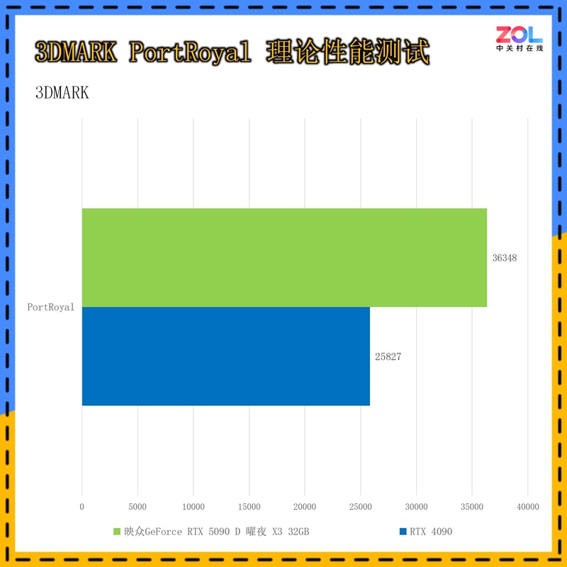 PortRoyal是3DMARK中专门针对光追性能的测试项,映众 RTX5090 D 曜夜 X3 32GB显卡相较RTX 4090的提升约为41%。