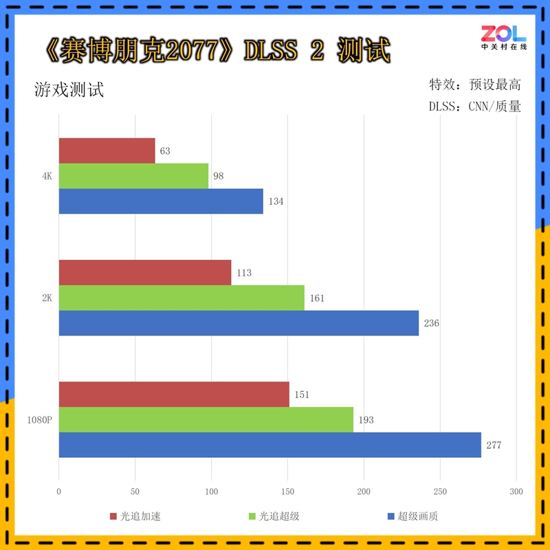 在DLSS 4的测试中,首先来看《赛博朋克2077》,我们会进行多角度对比,来看看不同DLSS的设置下,三档画质的帧数表现。在所有测试中,为保证缩放比例固定,我们均选择在质量模式下进行。