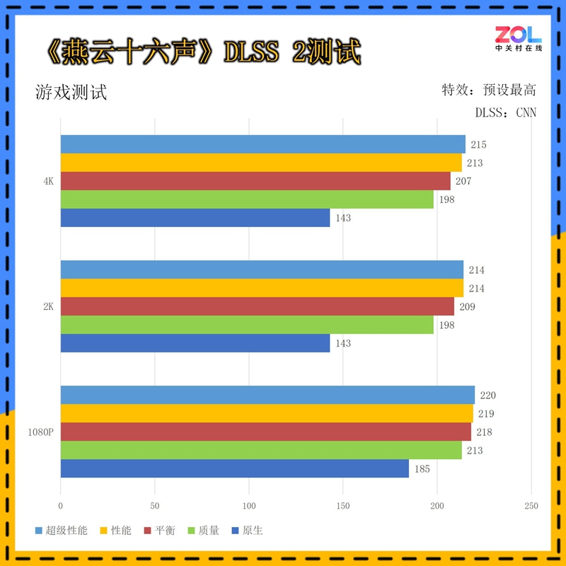 《燕云十六声》是网易开发的一款国产武侠大作,在DLSS 2的测试中,除了DLSS质量挡位与原生画质拉开差距,其他DLSS挡位出现了明显的则出现了明显的帧数瓶颈。至少从图形显示来看,低分辨率下的分数应该更高,似乎是与9800X3D的适配和优化出现了问题。