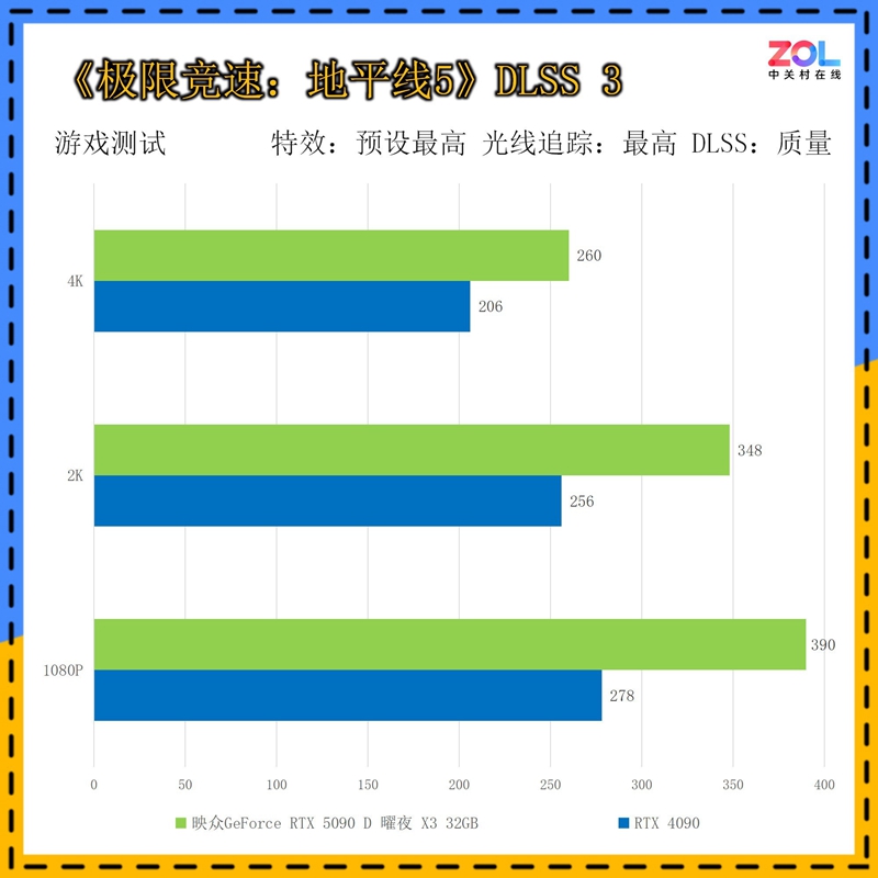 《地平线5》也是显卡测试的常驻游戏,其凭借出色的优化,在原生效果下即可跑出优秀的成绩。映众 RTX5090 D 曜夜 X3 32GB显卡在DLSS 3 4K分辨率下再创新高,达到260帧的成绩。