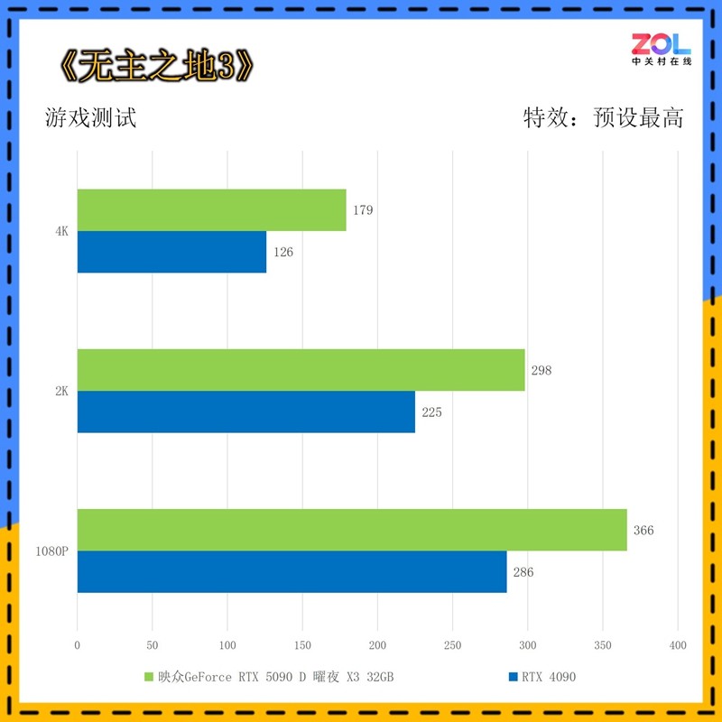 在《无主之地3》中,映众 RTX5090 D 曜夜 X3 32GB显卡相比RTX 4090的提升分别为:1080p提升28%;2K提升32%;4K提升42%,综合提升34%。在纯光栅化游戏帧数对比中,《无主之地3》比较能概括RTX 5090 D与RTX 4090的光栅化性能的综合差距。