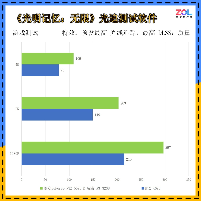通过DLSS的理论测试,不难发现8K@240帧对于这张映众 RTX5090 D 曜夜 X3 32GB显卡来说早已不是触不可及的目标,而在4K分辨率下,更是能达到恐怖的450帧。
