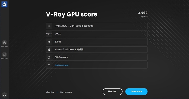 首先是V-Ray Benchmark,它可以测试GPU的RTX与CUDA性能。值得注意的是,映众 RTX5090 D 曜夜 X3 32GB显卡的RTX光追性能相比RTX 4090(5852)首测时提升154%左右。足以证明新架构在光线追踪中的显著效果。