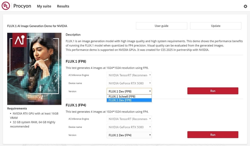 接下来是UL Procyon提供的FLUX.1 Dev绘画模型的FP4测试,毕竟对于FP4数据类型的支持也是RTX 50系显卡的全新特性。而且Blackwell架构新的Tensor Core特性不仅让生成所需的显存显著减少,在生成时间也有大幅降低,平均4张图片即可节省10秒时间。