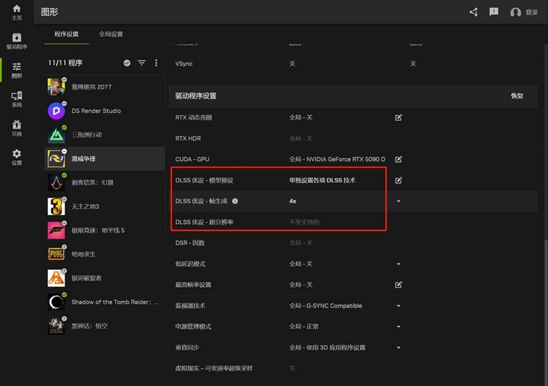 打开NVIDIA APP后,切换至图形选项卡,找到对应的游戏,拉至最下方【驱动程序设置】,找到DLSS模型预设,将内部选项全部调节至最新后,开启DLSS帧生成4X,即可享受帧数的暴力加成。