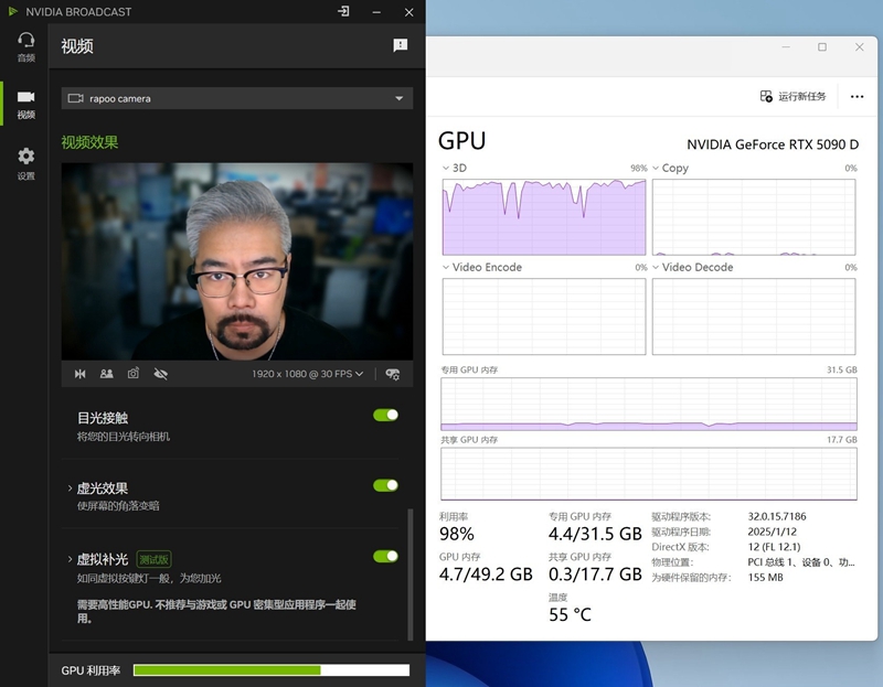 在新的NVIDIA Broadcast中,还增加了GPU利用率的显示,当软件中功能全部打开时,对于GPU的占用率还是非常高的,比较适合会议等不需要过多GPU参与的场景。而如果是游戏直播,则可适当关闭AI效果,以降低GPU利用率。