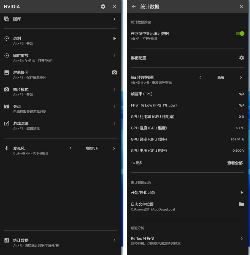 NVIDIA信息浮窗是游戏中很好的辅助工具,要开启此功能,需要在APP主界面的设置一栏中,开启按钮,之后按【ALT+Z】即可呼出边栏。