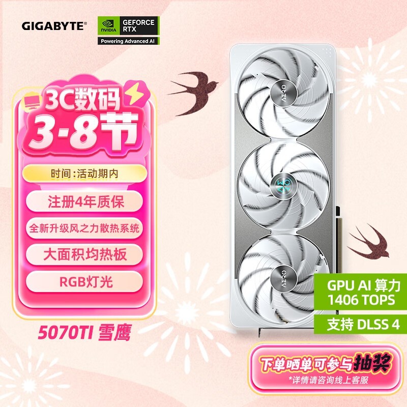 技嘉 RTX5070Ti显卡 雪鹰 AERO OC 16G DLSS4电竞游戏设计AI智能学习【注册四年保】