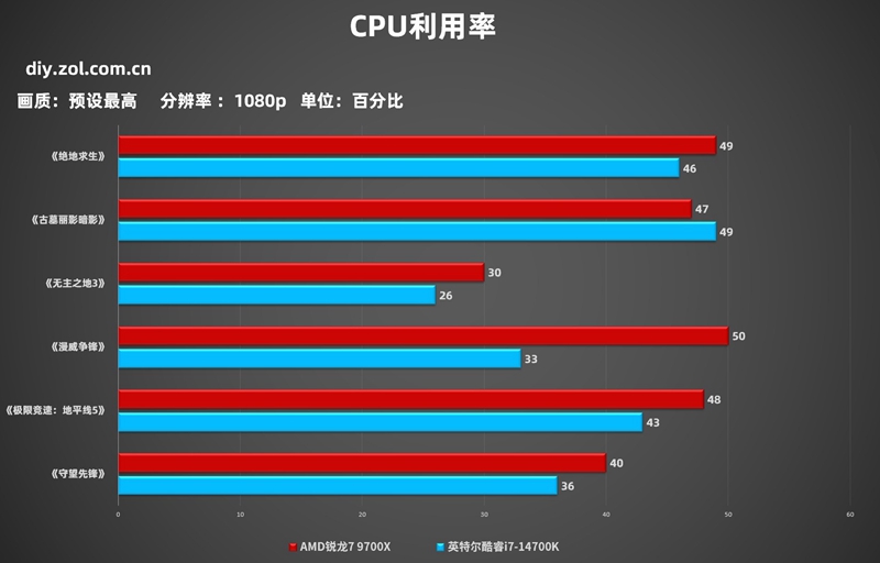 注意上面的表格不涉及成绩对比,只是游戏过程中的利用率占比展示。可以看到利用核心线程最多的《漫威争锋》也仅仅只达到了50% 左右,说明AMD锐龙7 9700X的8核16线程对于目前的这些主流游戏而言戳戳有余了,更多的核心线程对于游戏帧数提升有限,这也是核心更多的英特尔酷睿i7-14700K在参数上占优,实际游戏帧数上却无法占便宜的原因。