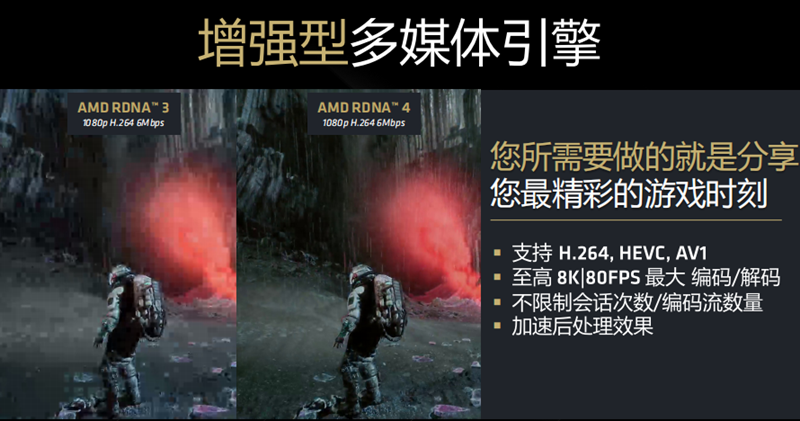 而在多媒体播放上面,RDNA 4架构采用了增强型多媒体引擎,在同样格式、同样码率的视频上,可以明显看出二者在画面表现上的区别。全新的RDNA 4架构支持H.264,HEVC,AV1等多种编码格式,支持至高8K/80Hz的编解码性能的同时,还不限制会话次数/编码流数量,并且能够加速后处理效果,提升工作效率。AMD通过持续创新,从RDNA时期的7nm工艺一直到RDNA架构的4nm工艺,通过不断迭代工艺,只为将发烧级游戏体验带给更多玩家。