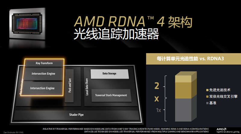 RDNA 4架构还重构了光线追踪加速器,相比RDNA 3带来了两倍的光线交叉引擎、全新的光线变化引擎以及全新的定向包围盒,通过双倍的光线交叉引擎以及先进的光追技术,RDNA 4相比RDNA 3每计算单元光追性能翻了一倍。而在加速机器学习方面,RDNA 4上新的FP8计算格式带来了更强大的运算性能,使其全面胜于RDNA 3架构。