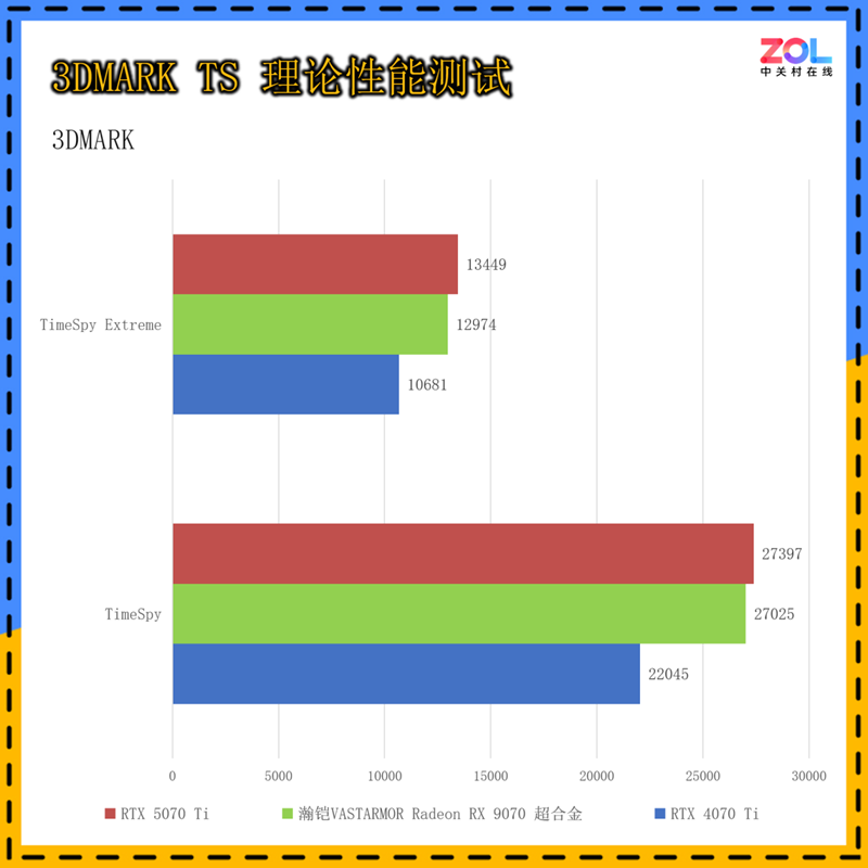 在针对DX12环境下的TimeSpy和TimeSpy Extreme测试中,瀚铠VASTARMOR Radeon RX 9070 超合金显卡的表现则会更好些,相比RTX 5070 Ti差距仅1%左右,在这项测试中基本可以认为两张卡表现一致。