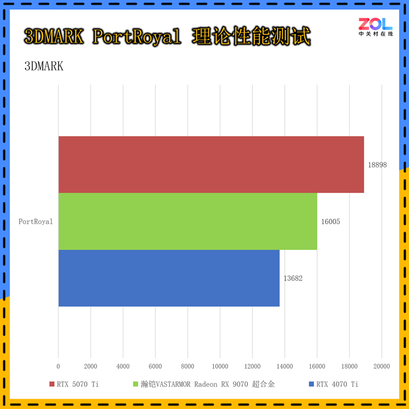 而在考验光追性能的PortRoyal测试中,瀚铠VASTARMOR Radeon RX 9070 超合金也摆脱了AMD光追落后的帽子,跑分依然是远远超越RTX 4070 Ti,领先幅度达到17%左右。