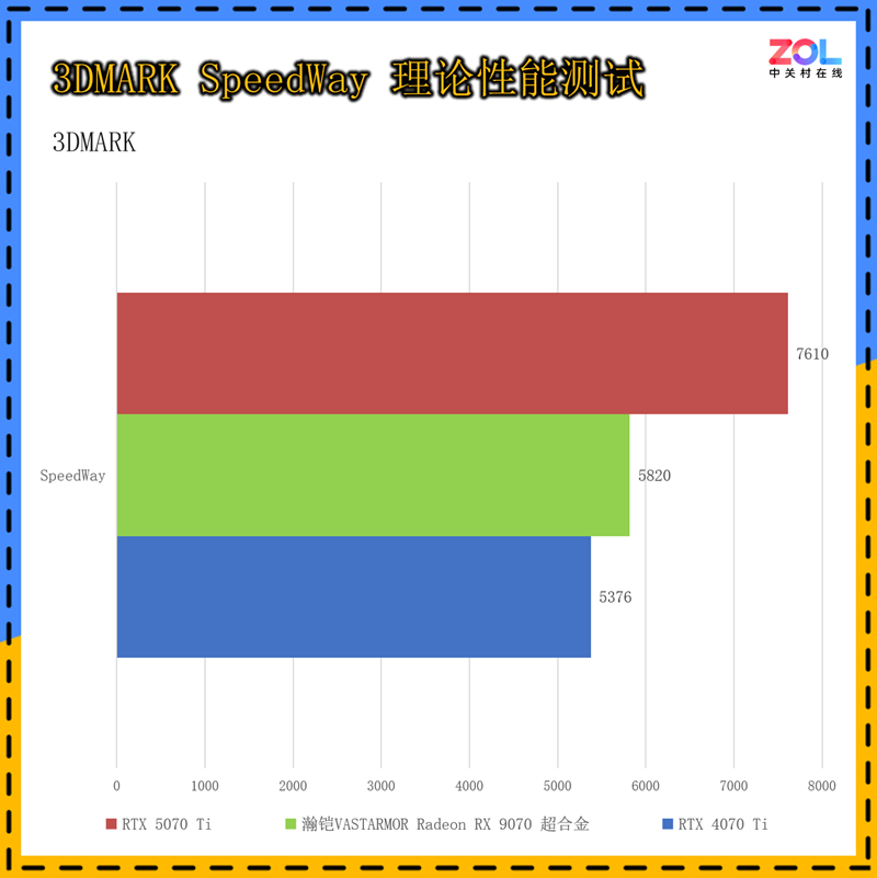 在针对显卡DX11性能的3DMARK FS套装测试中,瀚铠VASTARMOR Radeon RX 9070超合金显卡性能介于RTX 4070 Ti到RTX 5070 Ti之间。
