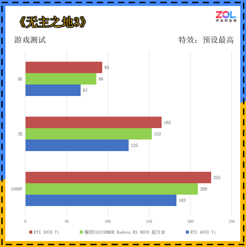 考虑到买A卡的用户首要目的大多是想要玩游戏,为此我们同样对瀚铠VASTARMOR Radeon RX 9070超合金进行了更进一步的游戏测试,首先是我们的老朋友《无主之地3》,作为一款优化出色、画风独特的FPS游戏,深受广大玩家的喜爱。瀚铠VASTARMOR Radeon RX 9070 超合金的帧数表现与跑分成绩基本吻合,三档分辨率相较于RTX 4070 Ti综合提升达到了21%。