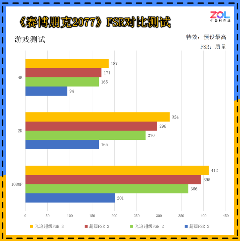在《赛博朋克2077》游戏中,我们对比了不同FSR模式下,三档分辨率的帧率表现,瀚铠VASTARMOR Radeon RX 9070 超合金仅4K+超级FSR2测试低于三位数,其他模式下均能达到100帧以上,保证玩家能够流畅游玩。