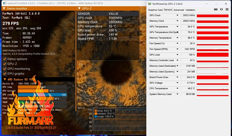 瀚铠VASTARMORRadeon RX 9070超合金在半小时左右的满载烤机过程中,温度稳定为54℃左右,热点温度75℃,显存温度88℃,风扇转速30%(1341RPM),功耗为245W。