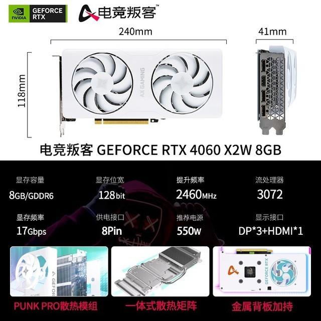 电竞叛客 RTX4060 X2W 8G DLSS 3 台式机电脑电竞游戏/AI渲染设计独立显卡 RTX 4060 X2W 8G