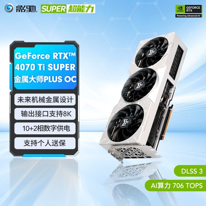 影驰 RTX4070Ti Super 是一款高性能显卡,采用了未来机械金属设计,外观酷炫且耐用。这款显卡支持个人送保,购买更放心。现在京东售价为6899元,下单即享600元优惠,到手价仅为6299元包邮。