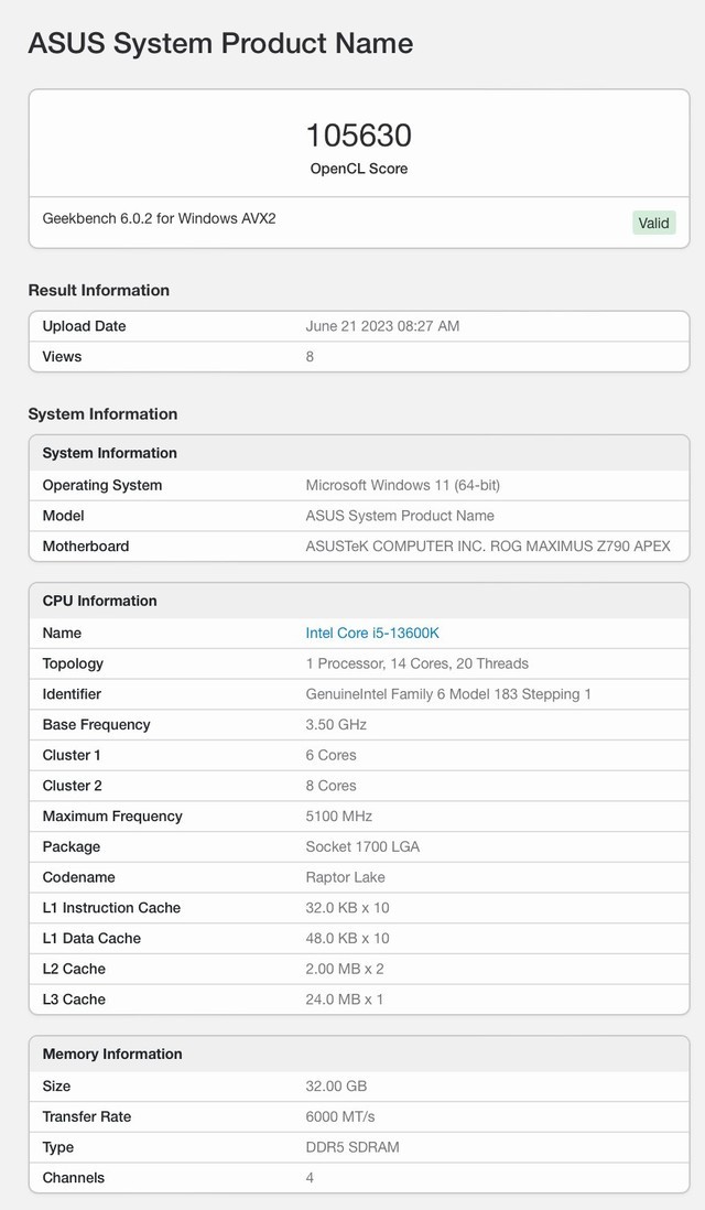 据报道,英伟达即将于6月29日发布RTX 4060显卡,售价从2399元起。近日,该显卡的OpenCL跑分在Geekbench上曝光,搭配i5-13600K处理器,跑分高达105630分。