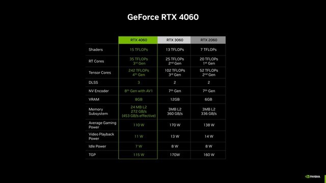 相比于老款RTX3060 12G,RTX 4060的跑分提升了11%,符合英伟达官方公布的数据。官方数据还显示,开启RTX 40系列显卡独有的帧生成技术后,RTX4060性能为RTX 3060的1.7倍,关闭后为1.2倍。RTX4060桌面显卡规格与移动端基本一致,包括3072个CUDA核心、8GB 128bit显存、115W功耗和110W平均游戏功耗,较上一代有明显下降。