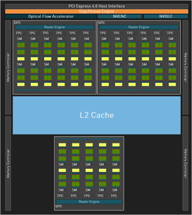 如果在L1缓存中找不到内核计算所需的数据,GPU将在L2数据缓存中寻找。这个显存系统位于GPU芯片上,并通过一个非常高速的横梁系统连接到所有的GPC(图形处理集群),每个GPC包括多个SM。如果在L2缓存中找到了信息,那么GPU就挑出这些数据并将其放入内核。