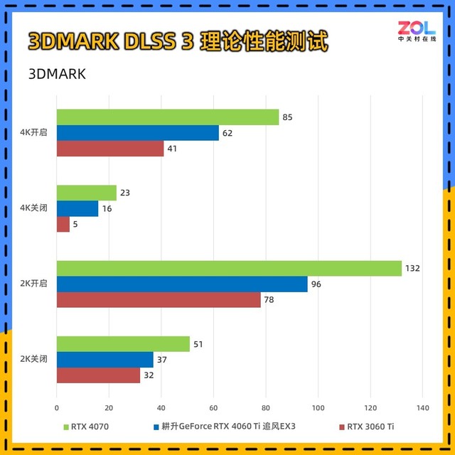 另外我们使用3DMARK刚刚更新的DLSS 3进行了相关性能测试。不过由于RTX3060Ti无法开启,这里使用DLSS2进行对比测试。