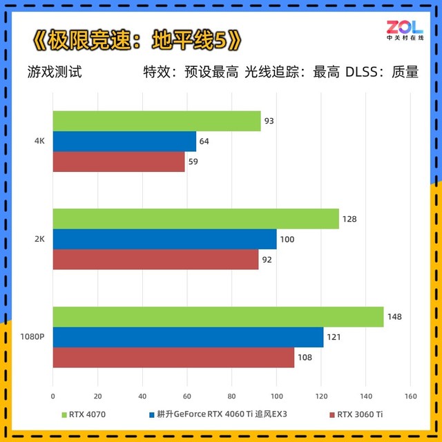 在《极限竞速:地平线5》中,耕升 RTX4060Ti 追风EX3相比RTX3060Ti的提升分别为:1080p提升12%;2K提升9%;4K提升8%,综合提升10%。