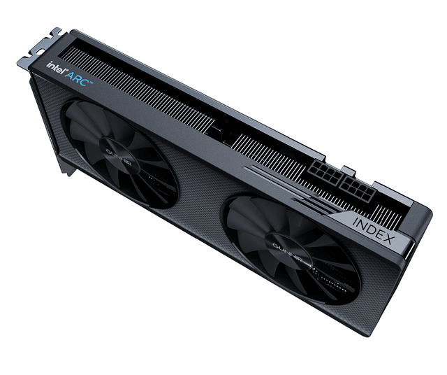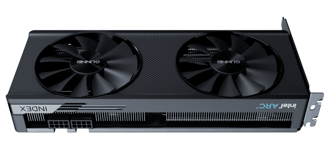 蓝戟A580Index显卡外观设计严谨规整,棱角分明,尺寸253*115*42mm,是一种非常标准的双槽卡规格,可以兼容市场上绝大多数的机箱,方便用户日常安装。双风扇设计在显卡正面,全黑色配色简洁大方,质感和手感也相当出色。显卡顶部平整,左右两侧“IntelArc”和“INDEX“显卡的DNA也显示出来了。此外,显卡还配备了双8pin外部电源接口,与这一级别的显卡相比,8Pin*2提供了很高的超频潜力。显卡在显示输出接口处采用3个DP接口和1个HDMI接口的方案,支持四个屏幕显示。此外,蓝戟A580Index还为玩家配备了全金属一体化背板,保护PCB和核心,同时也提高了显卡的整体美学。