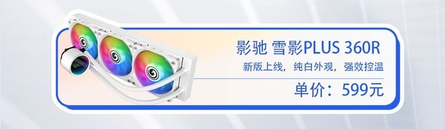 全新雪影水冷在线,纯白外观,五颜六色的灯光效果,为静音而生,为性能保驾护航;纯铜底座覆盖准确,无缝贴合,多平台高度兼容,配备专用高压风机,散热能力强;整体配备幻灯片效果,安装更加炫目;目前价格是599元。