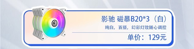 白色半透明风扇叶片,运行效率高,噪音低,配备4PIN速度控制接口和5V3PINARGB灯光接口,可实现多重幻灯效果,风格可任意切换,带来舒适的视觉体验;目前的价格是129元。