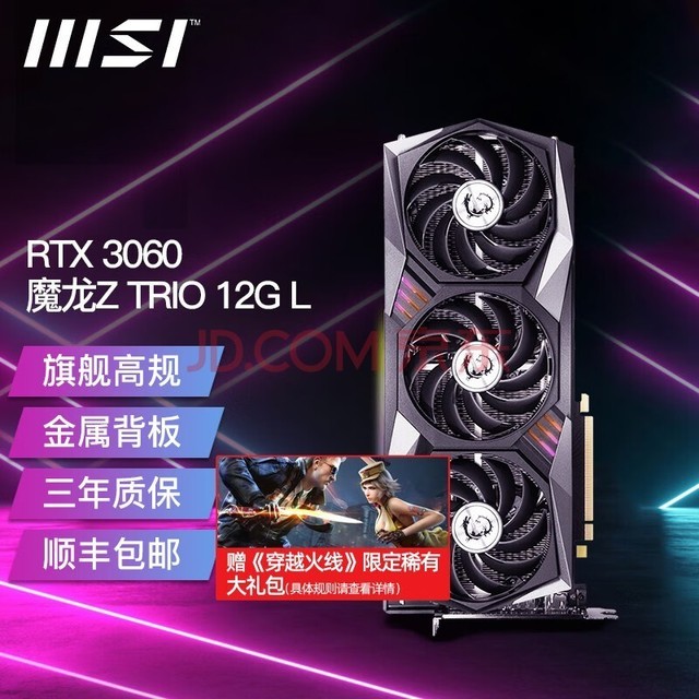 微星 RTX3060-魔龙Z-TRIO-LHR电竞游戏显卡正在京东热销,在APP下单并参加百亿补贴活动,到手价2779元,近期好价!这款魔龙Z显卡,拥有3584个流处理器和12G大显存,显存位宽192bit,计算能力非常强悍,能够很好的支持各类游戏,连绝地求生和永劫无间的效果全开时也很流畅。此外,显卡拥有RGB的灯光效果,并且支持自定义调节颜色。配备刀锋6代风扇,散热和静音效果非常好。支持自动超频功能,来发挥显卡的最大潜能,有喜欢的朋友不要错过了。