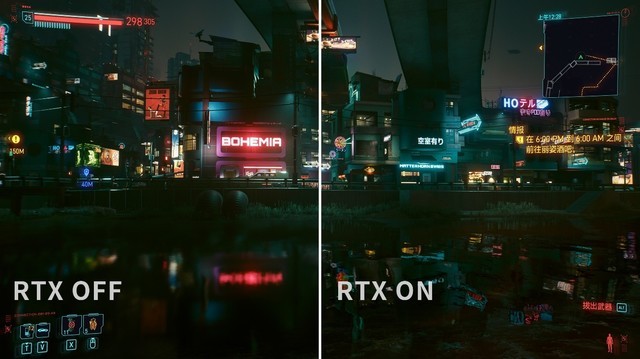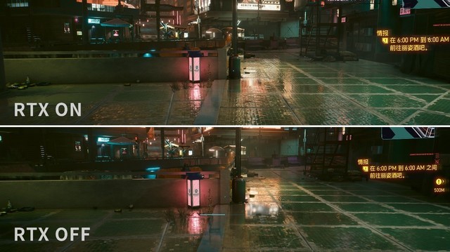 进入游戏,开启RTX能够获得巨大的画质提升,如图所示,在未开启RTX的状态下,无论是地面还是水面的灯光反射效果糊成一团,仅出反射出部分的光源,并且毫无细节可言。但是一旦开启了RTX选项,画质就发生了翻天覆地的变化。水面中光源的反射清晰可见,能够根据水流的变化而事实呈现不同的效果,近乎于现实当中,人们肉眼所看到的水面反射效果。而在湿漉的砖地场景当中,每一块被雨临淋湿的砖瓦都呈现出不同的反射效果,地面细节相较RTXOFF更为清晰,可见全景光线追踪能够大幅度提升光影效果的表现。