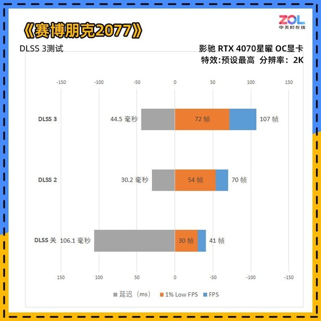 在《赛博朋克2077》中的数据反映比较真实,可以看到在DLSS关的光线追踪最高的情况下,即影驰 RTX4070 星曜 OC显卡显卡也只有41帧,并且延迟达到了106.1毫秒。