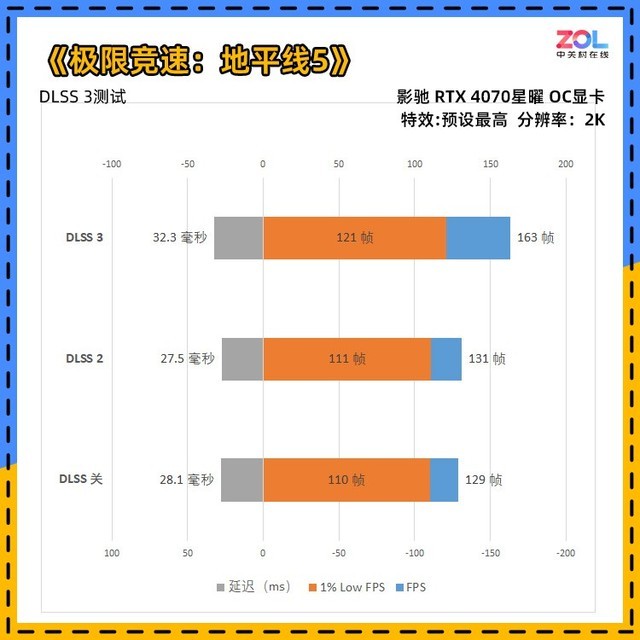 《极限竞速地平线5》是最新加入DLSS 3的游戏,可以看到,即便在开启DLSS 2的情况下,帧数受到CPU瓶颈限制,几乎与DLSS关闭帧数相同。而在开启DLSS 3后,一下跃至163帧,提升约28%。
