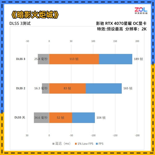 《暗影火炬城》在开启光追后对于性能要求明显提高。其中DLSS 3相比DLSS关的帧数提升约84%,DLSS 2的提升约60%。不过此次《暗影火炬城》对比刚刚发布时,1% Low帧数有明显下降,预计可能是优化还没有跟上。