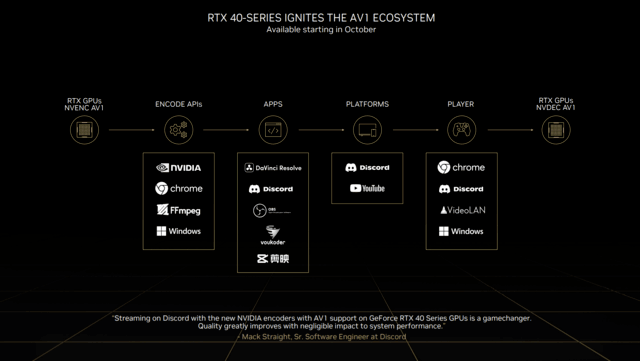 所以,如图所见。NVIDIA已经为广大用户铺好了一条完整的生态链,从编码API、软件、平台到播放器,将全面支持AV1编码。
