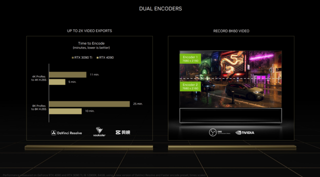 本次升级的第八代NVENC编码器可以说是直播、视频、后期工作者的极大福音。它首次加入了对AV1编码的支持,最显而易见的效果就是直播。