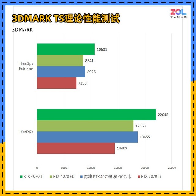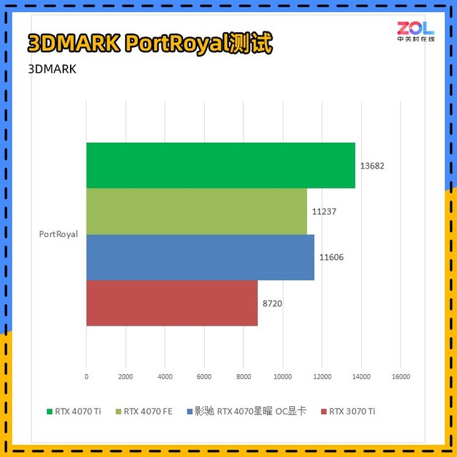 而对比刚刚发布的RTX4070Ti,光追测试综合成绩相差19%左右,不过相较于公版,影驰 RTX4070 星曜 OC显卡提升3%。