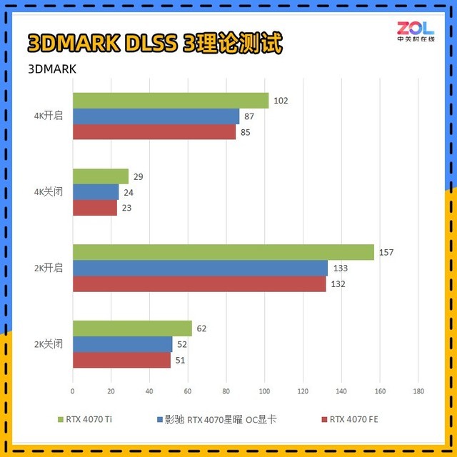 另外我们使用3DMARK刚刚更新的DLSS 3进行了相关性能测试。并且由于RTX3070Ti无法开启,故不参与测试,仅对比RTX4070Ti和公版RTX4070,影驰 RTX4070 星曜 OC显卡也是全面超越公版。