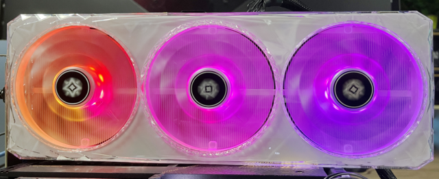 这款显卡采用了纯白设计,透明外壳用钻石切割工艺设计,外壳上盖还切割了不规则棱镜,当灯光透过时,会像钻石般闪耀着耀眼光芒。这个透明外壳可拆卸,不仅方便后续清理,还支持更换外壳设计,目前有5种风格外观可以替换,下面就是更换后的外壳。